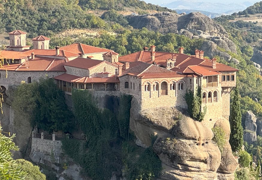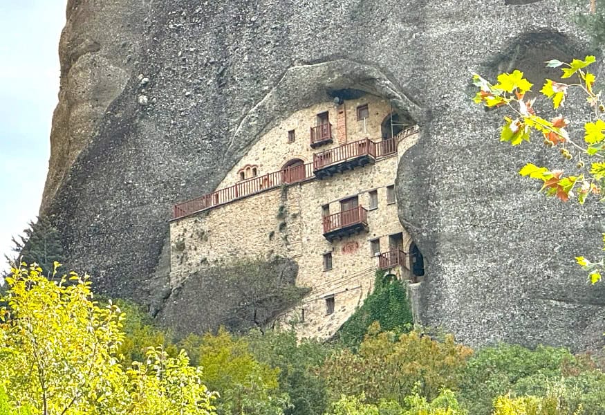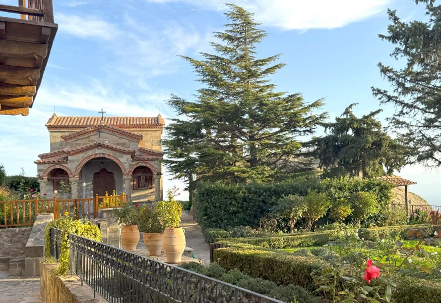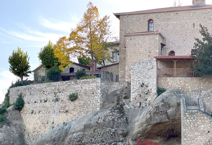 As you enter the monastery, you’ll find serene grounds that chronicle centuries of monastic existence. Carefully tended with lovely flowers, the courtyards house the main church and a former refectory that is now a museum. But the back terrace is the true attraction. Views of a “forest” of enormous rock formations, other monasteries, including the Great Meteoron, and the vast Thessaly plain below can all be seen from this location.