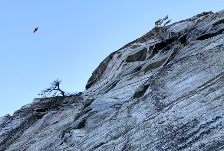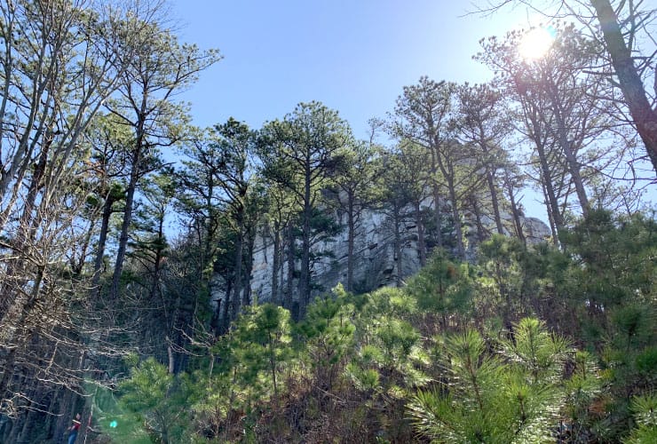 As you walk along you’ll see Big Pinnacle getting closer through the trees just off to your left. You’ll past the trailhead for the Ledge Springs Trail to your right and happen upon an inverse L-shaped tree seemingly designed specifically for a picture spot. At a Y make sure to take the stone stairs up and to your right to begin your counter-clockwise journey around the base of Big Pinnacle. You might find yourself stopping to get a great view of the sun shining through the wings of the many hawks flying around the top of the peak.